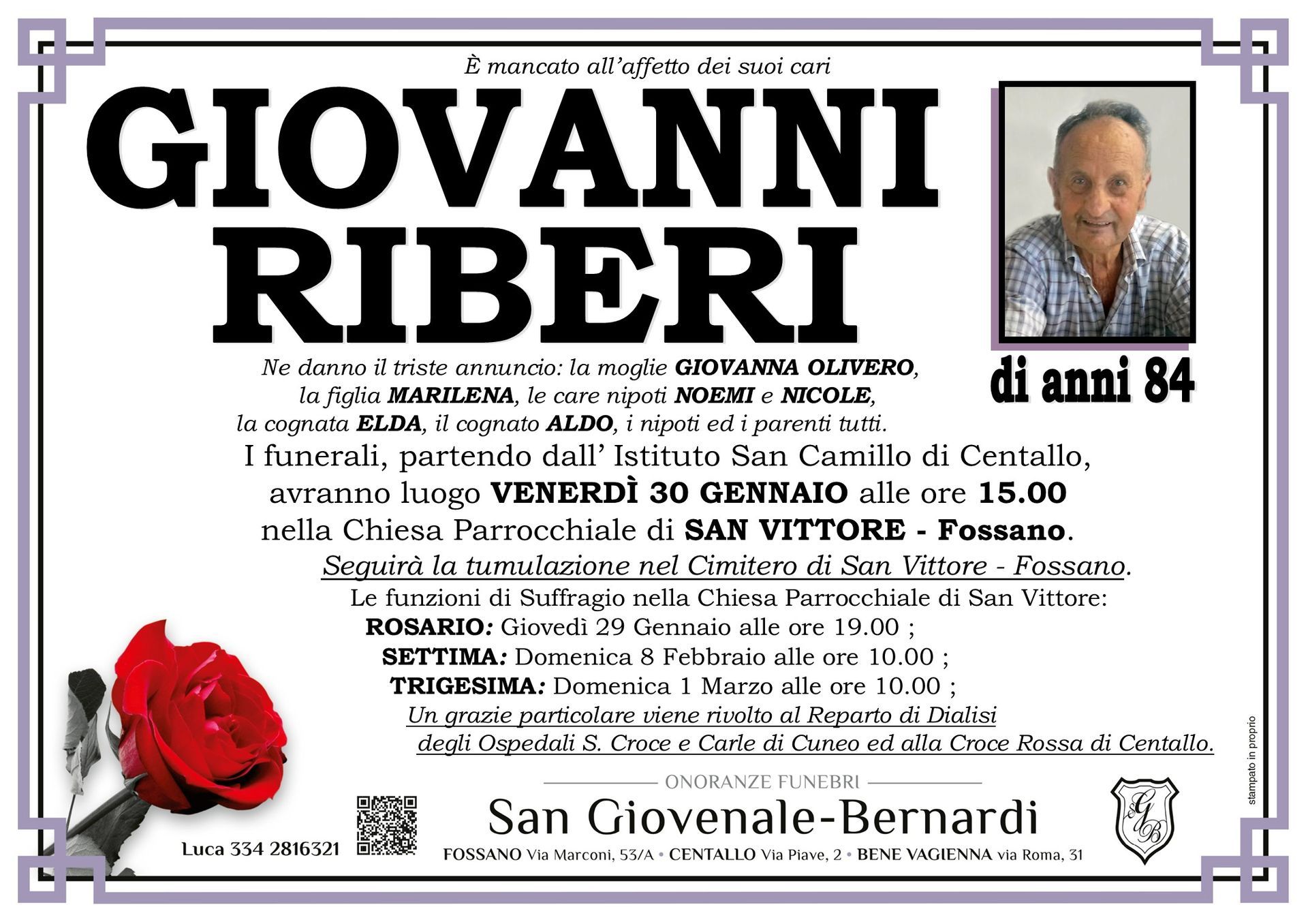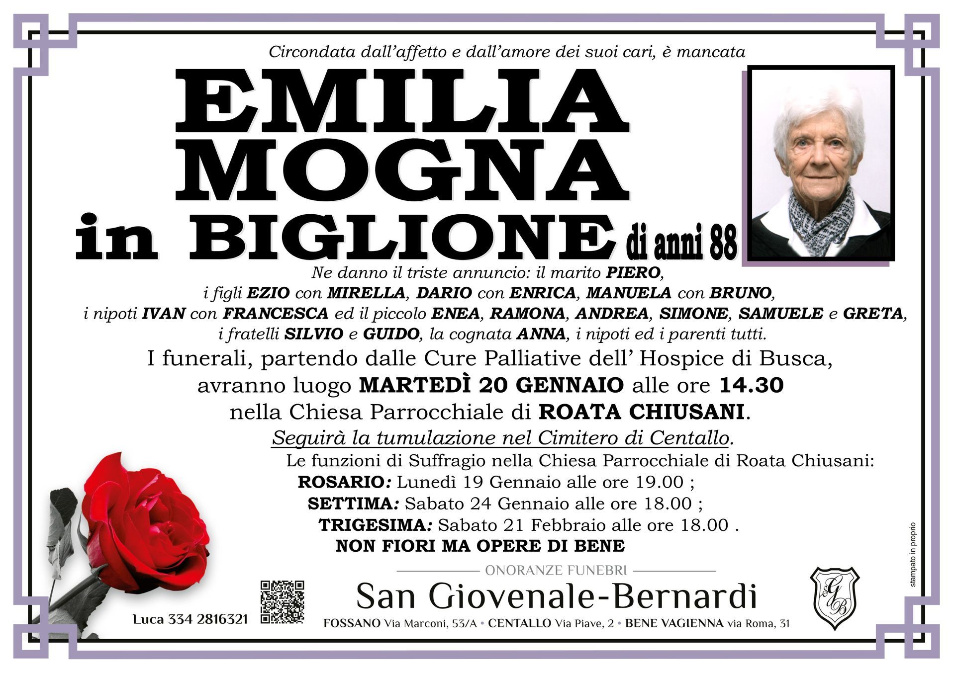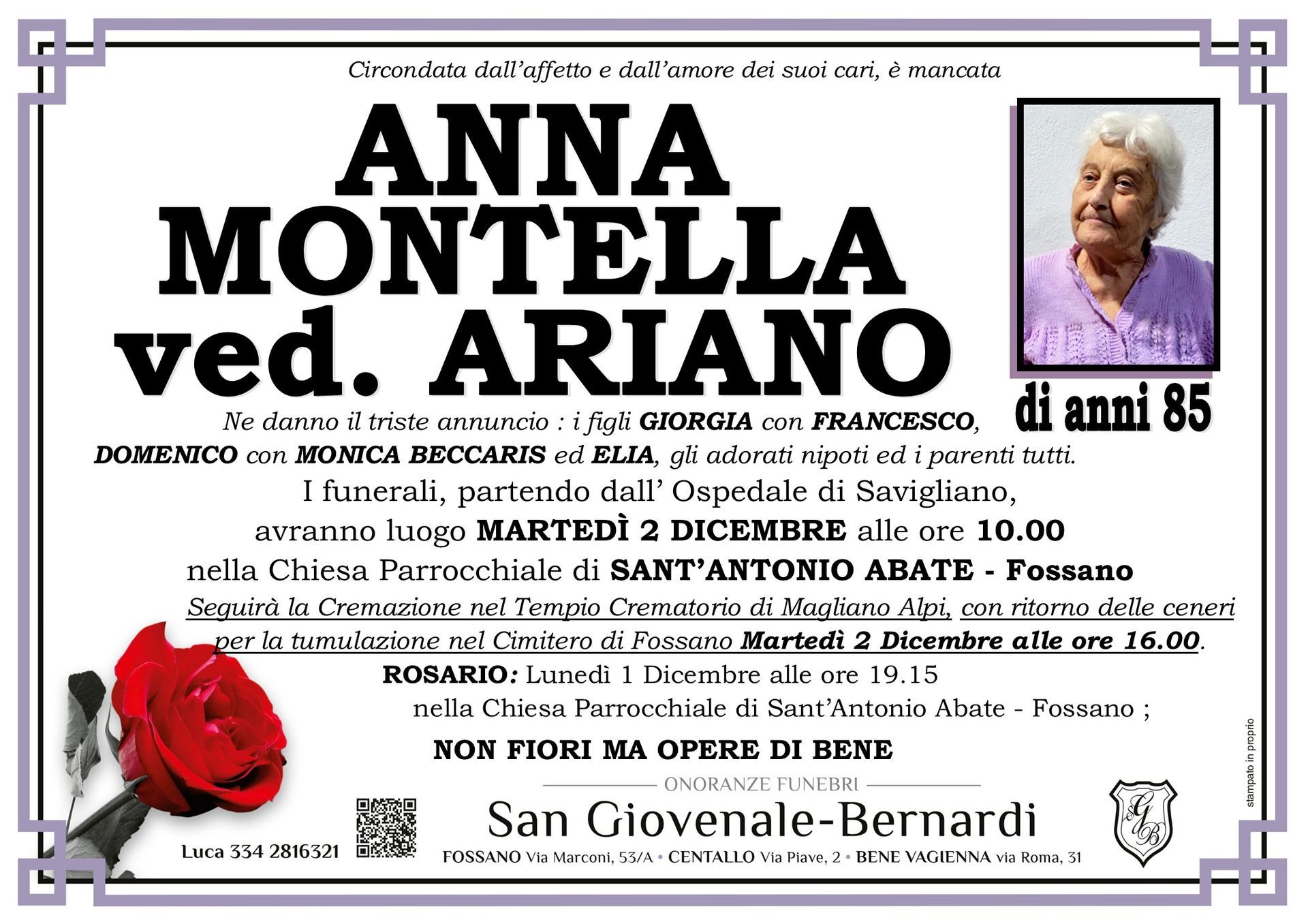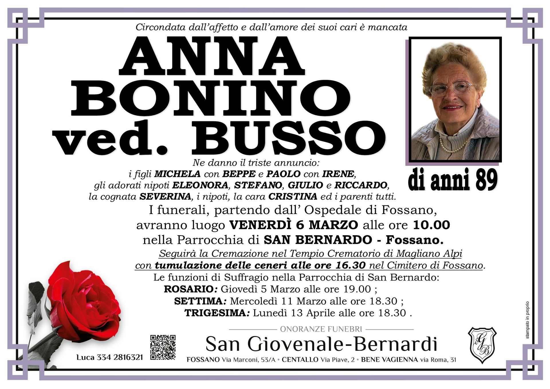 Onoranze funebri San Giovenale - Bernardi è un'agenzia funebre dedicata a fornire supporto e conforto alle famiglie di Fossano, Centallo, Bene Vagienna e dei comuni limitrofi di tutta la provincia di Cuneo ovunque sia richiesto in momenti difficili.