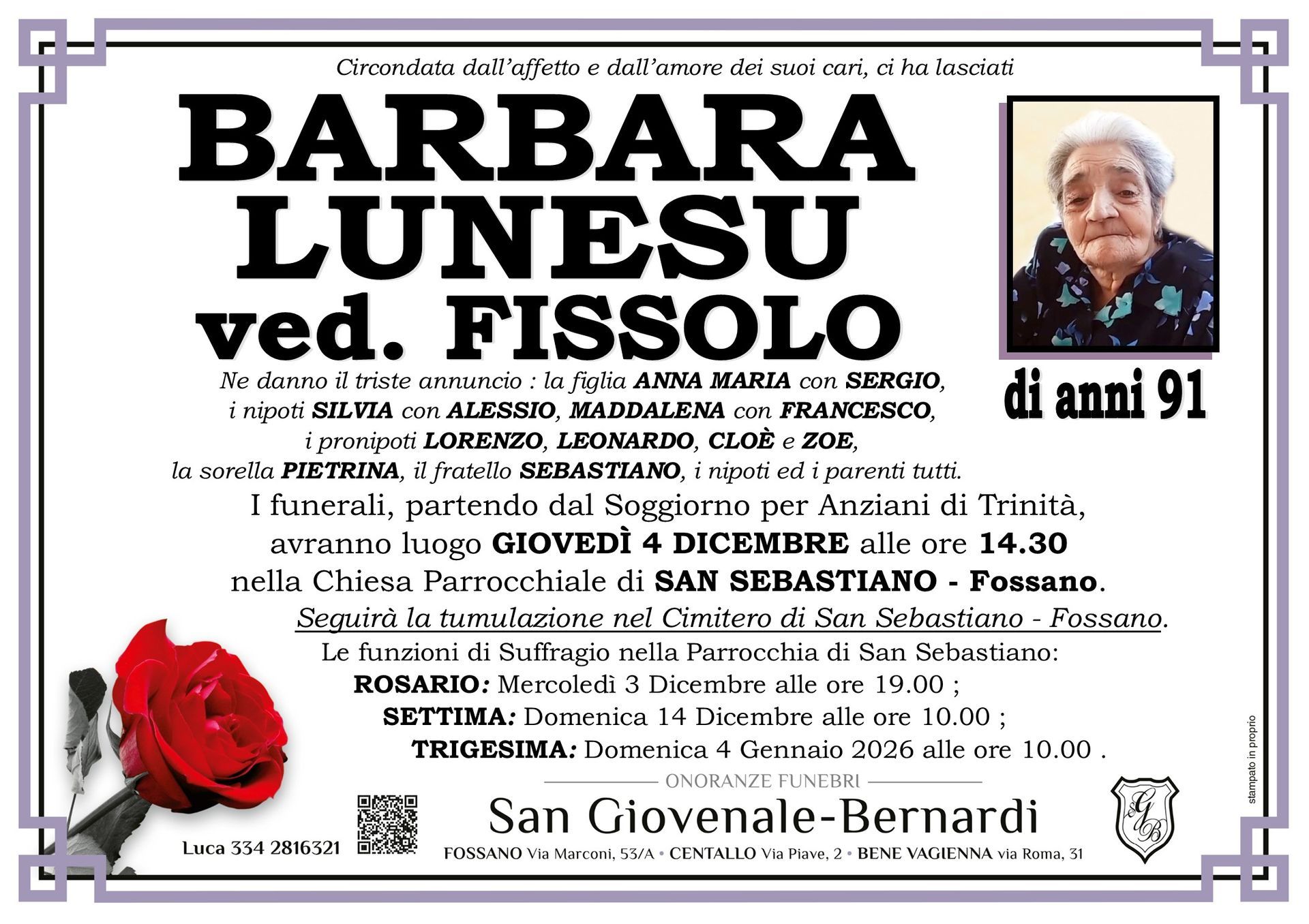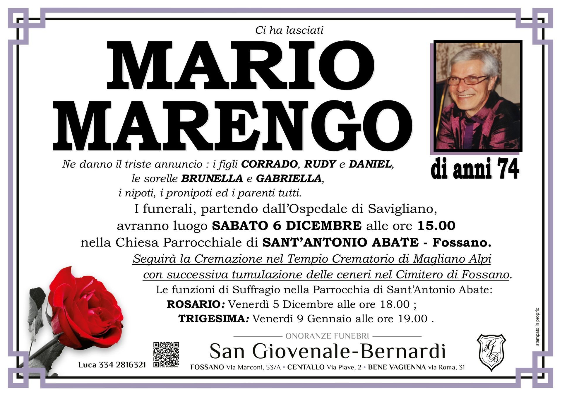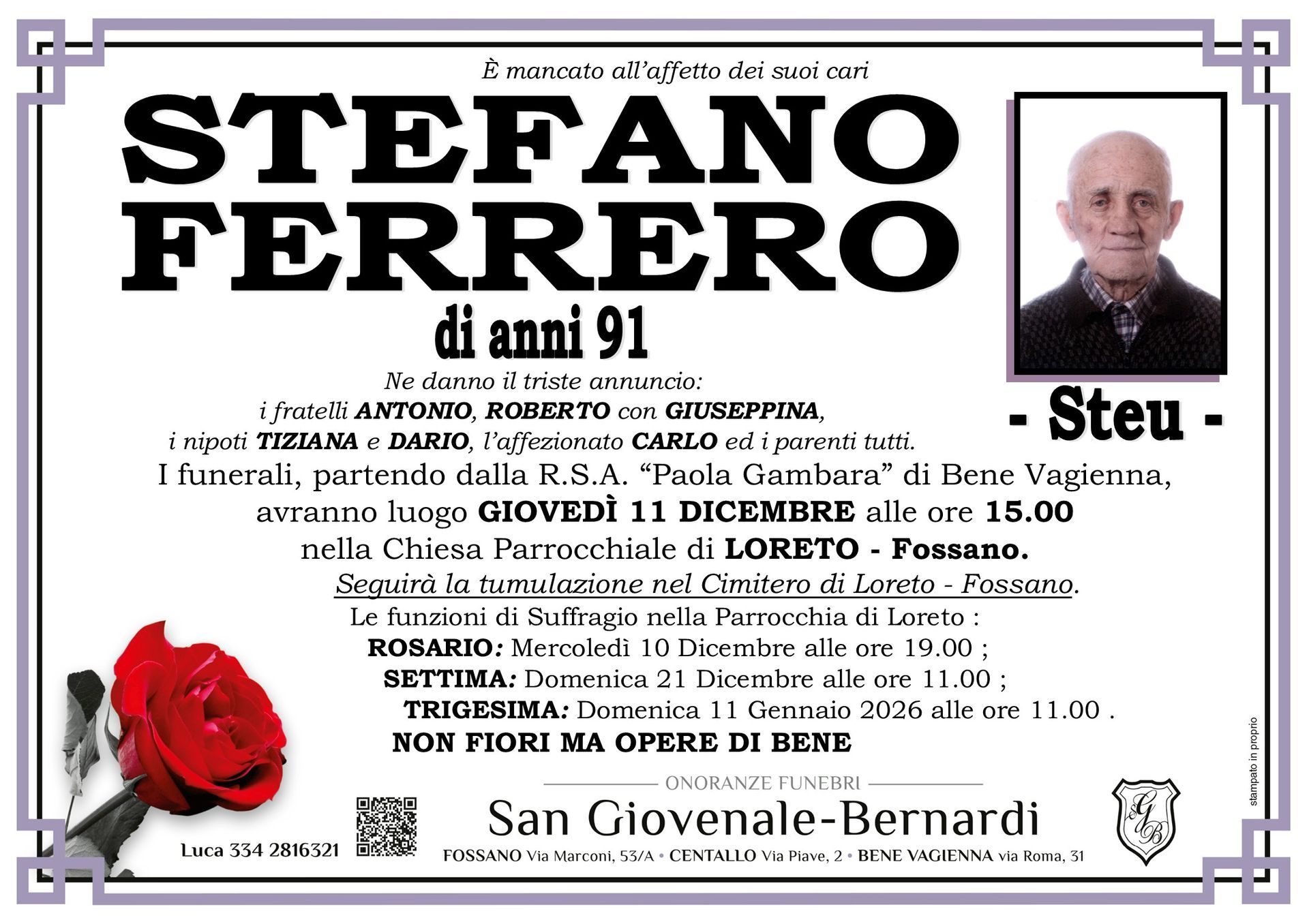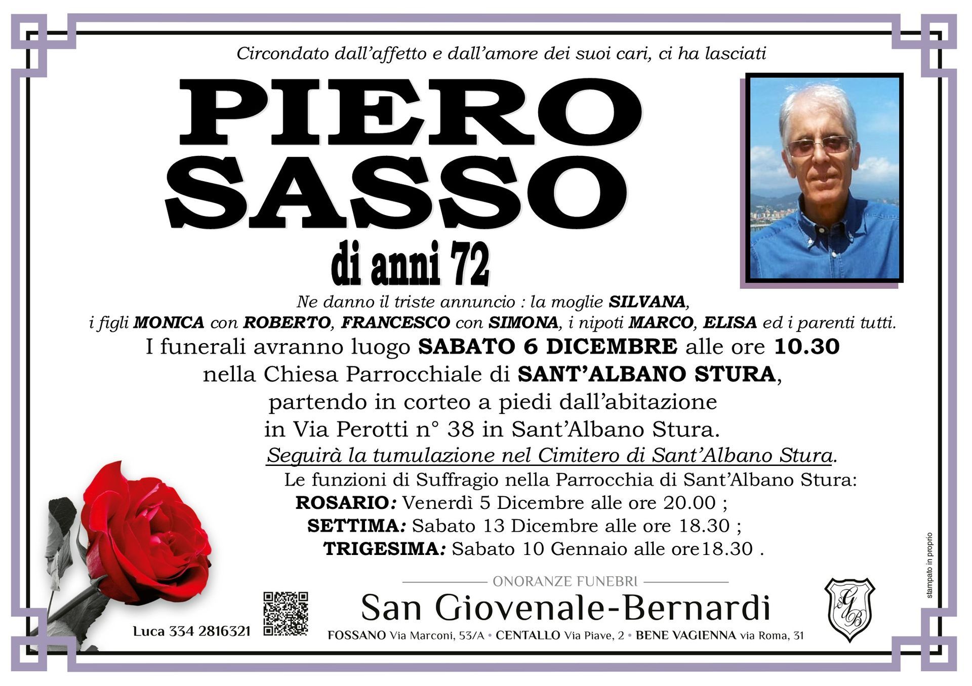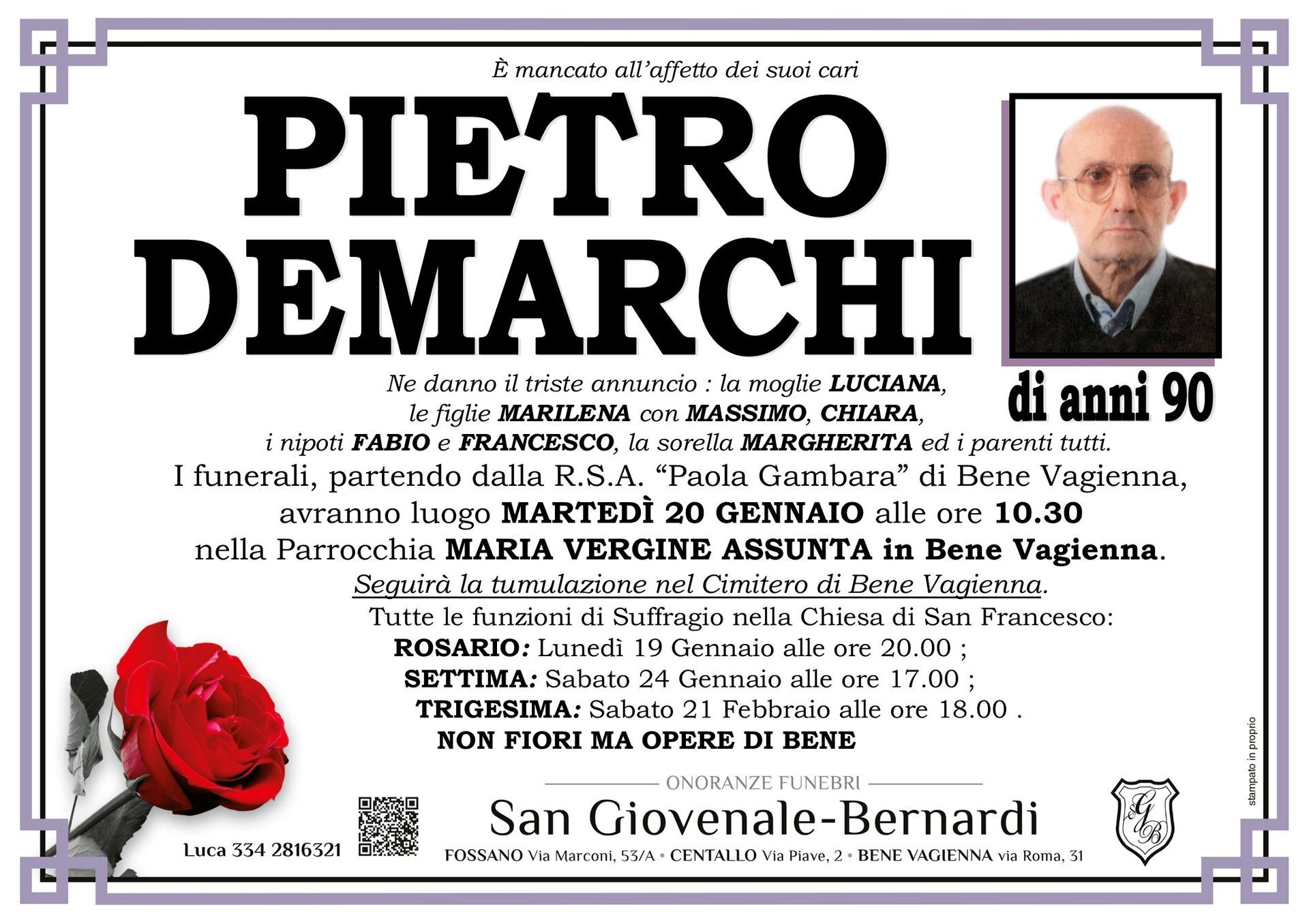Onoranze funebri San Giovenale - Bernardi è un'agenzia funebre dedicata a fornire supporto e conforto alle famiglie di Fossano, Centallo, Bene Vagienna e dei comuni limitrofi di tutta la provincia di Cuneo ovunque sia richiesto in momenti difficili.